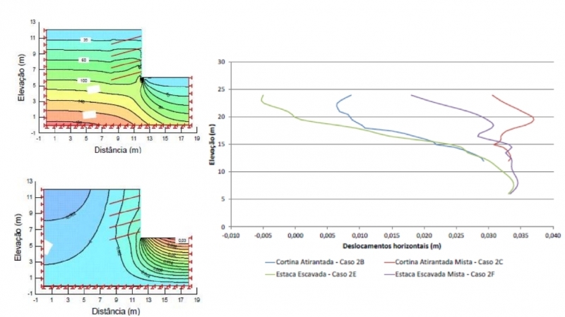 As obras com escavações e sistemas de contenção são a cada dia mais comu ns nos centros urbanos, seja pelo aumento populacional, preocupação às edificações vizinhas, redução de espaços físicos, proximidade das edificações, custos dos terrenos, valorização dos imóve is, ou mesmo por questões de segurança pública. Como solução, há diversas formas de sistemas de contenção com vistas a escavações para construção de subsolos. No Distrito Federal , há edificações com mais de quatro subsolos de forma a aproveitar ao máximo o terreno a ser edificado, principalmente com vagas de garagens. Dentre as soluções, as mais utilizadas para contenção de escavações são solo grampeado, estaca escavada (sem revestimento, hélice contínua e estaca raiz), perfis metálicos cravados, e cortinas atirantadas. E com a necessidade de se executar subsolos, este artigo objetiva avaliar a tensão-deformação de cenários em contenção envolvendo solução única em solo grampeado e combinada com cortina atirantada e estaca escavada. Nesse cenário, avalia-se o a tensão-deformação para contenções envolvendo sete casos comuns para obras com escavações. O estudo da tensão-deformação é realizado com apoio do sistema computacional GeoStudio 2012, módulo Sigma, com solução numérica por elementos finitos. Os estudos são desenvolvidos para dois cenários. O primeiro para obras com escavações de profundidade 6 metros, e o segundo para obras com escavações de altura igual a 12 metros. No primeiro cenário, avaliam-se situações ancoradas em elementos passivos, com a solução apenas em solo grampeado. No segundo cenário, a solução em tirantes protendidos, ancoragens mistas ativas e passivas, e face em parede estruturada ou estacas escavadas. As avaliações mostram que nas obras em solo grampeado, altura de 6m, os deslocamentos de face indicam pouca influência da rigidez da face. No entanto, o mesmo não ocorre com as cargas de trabalho dos grampos. No caso analisado, verifica -se o aumento de 75% registrado no grampo inferior quando adotada parede estruturada em relação ao concreto projetado. Já para obras com escavações de 12m, o resultado mostra melhor eficiência, em termos de deslocamento, do sistema em estacas com ancoragem protendida. No entanto, um melhor custo benefício pode ser alcançado pelo sistema em cortina mista, ao se aplicar elementos passivos na região superior e elementos ativos na região inferior. Neste caso, tem -se uma boa equalização dos deslocamentos. A face tem um deslocamento horizontal mais uniforme, similar a uma translação.